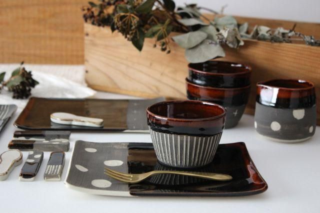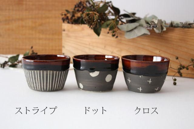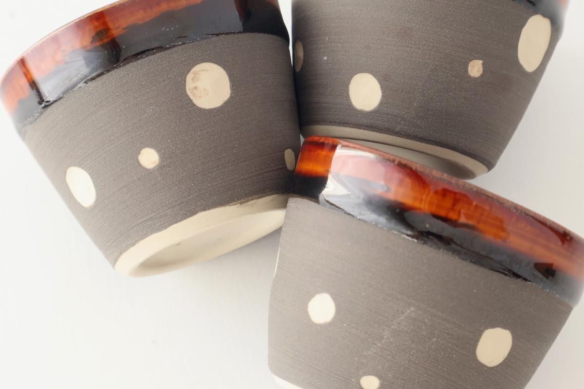 つやつや飴色と、マットな質感にドットの柄が入った、ツートンのフリーカップです。