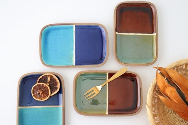 カーキと茶のツートンカラーが、目を引く角皿です。