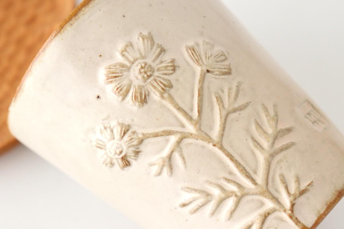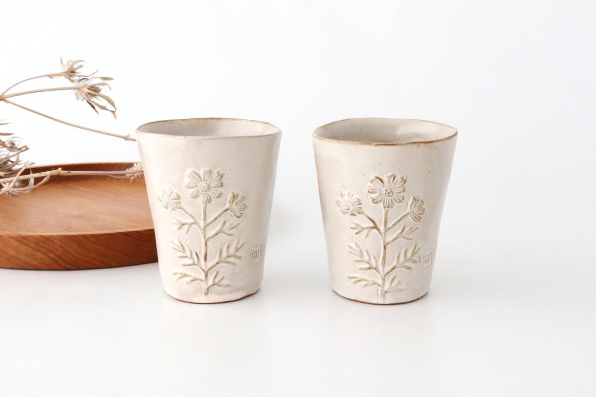 優しい表情の、コスモスが彫られたタンブラーです。