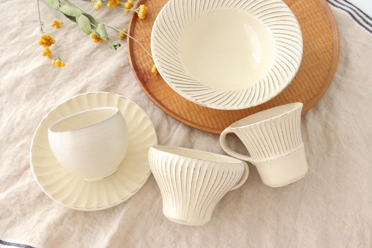 鎬や面取りといった、丁寧な手仕事の美しさが光る粉引のうつわは、ながく大切に使いたくなる魅力があります。