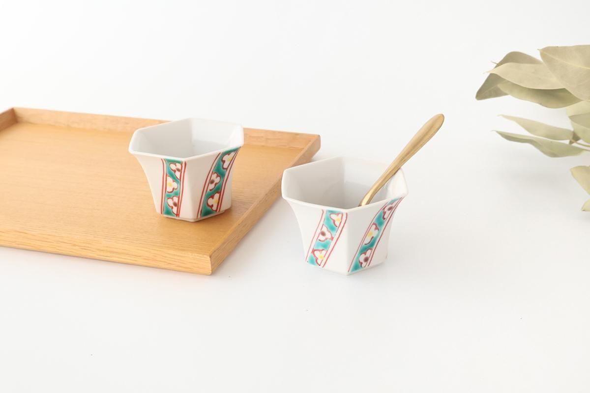 九谷焼らしい白くつるりとしたうつわに、赤いラインとカラフルな絵柄が映えます。