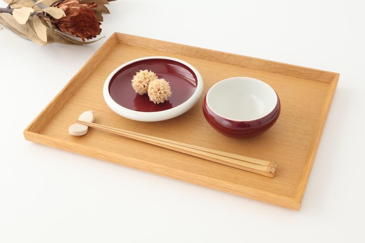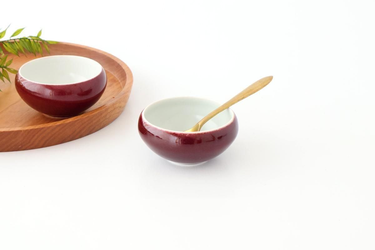 磁器土ならではの白と、銅で発色させるガラス質の赤のうつわです。