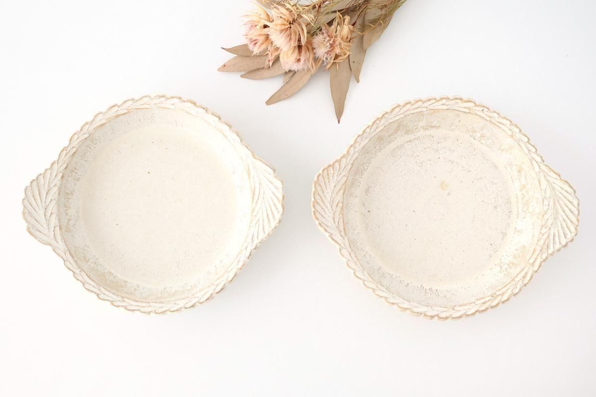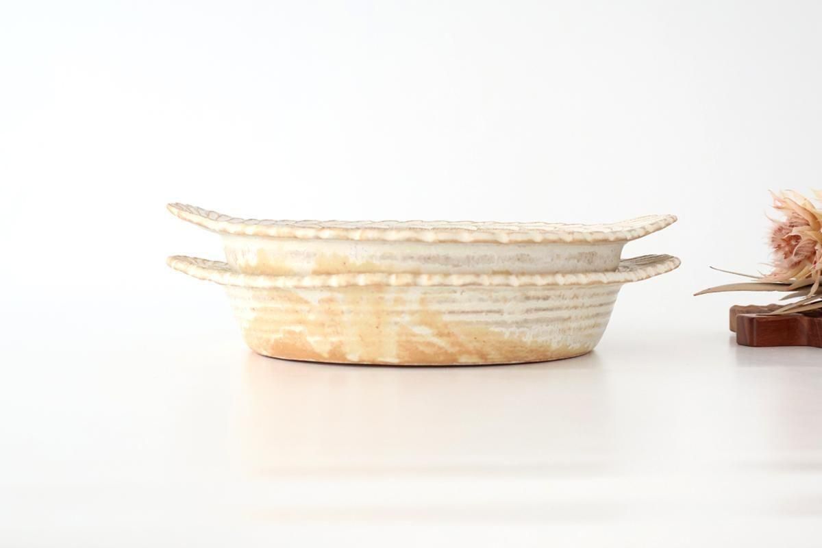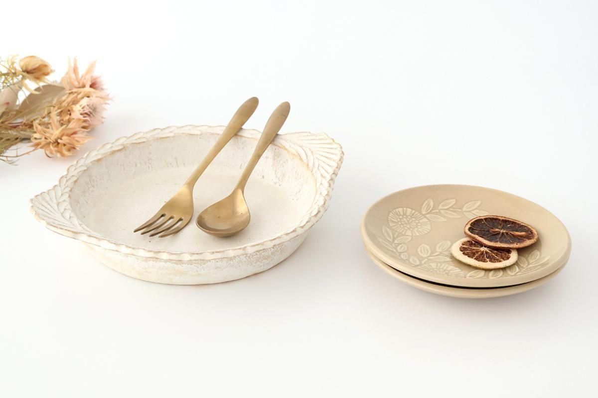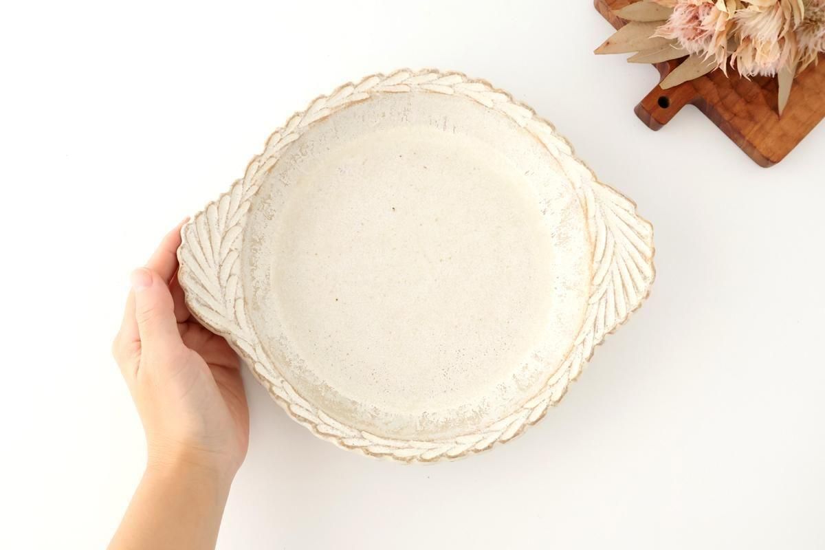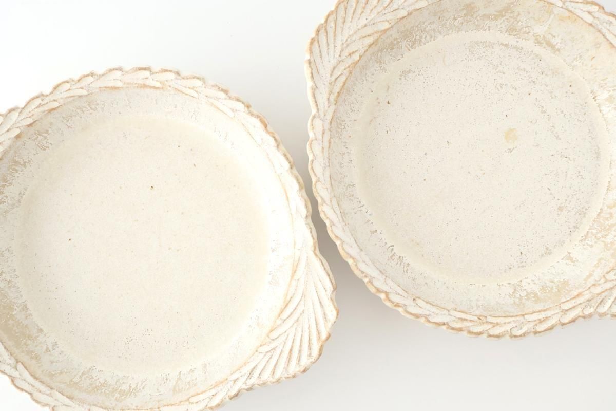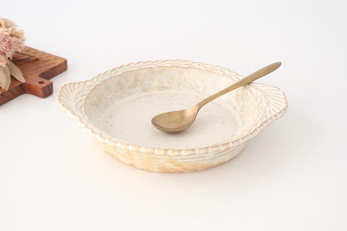 縁を飾るリース模様がアクセントになった、グラタン皿です。