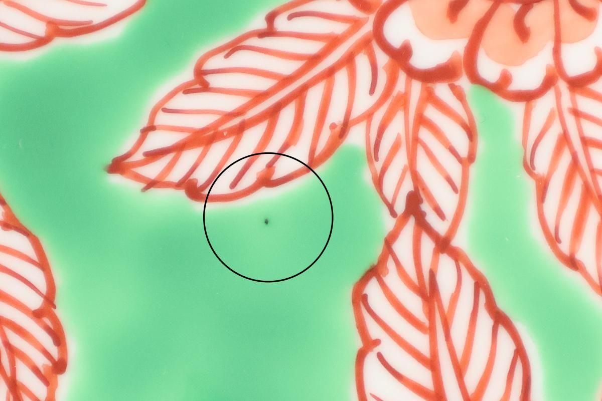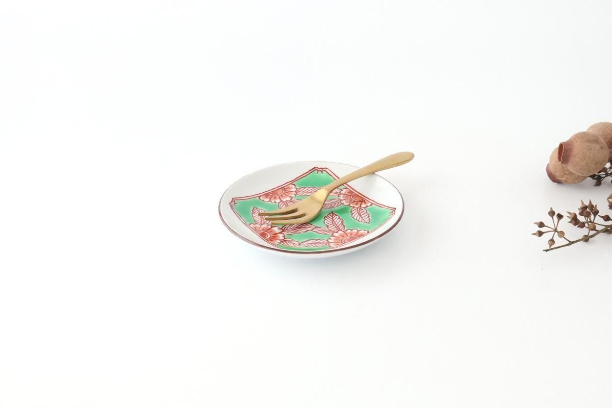 鮮やかな緑と赤の色で描かれた、豆皿です。